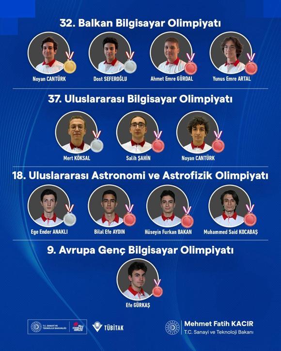 “İtalya’da düzenlenen 32. Balkan Bilgisayar Olimpiyatı’nda 1 Altın, 1 Gümüş ve 2 Bronz; Bolivya’da düzenlenen 37. Uluslararası Bilgisayar Olimpiyatı’nda 1 Gümüş, 2 Bronz; Hindistan’da düzenlenen 18. Uluslararası Astronomi ve Astrofizik Olimpiyatı’nda 1 Gümüş, 3 Bronz; Bulgaristan’da düzenlenen 9. Avrupa Genç Bilgisayar Olimpiyatı’nda 1 Bronz madalya kazanan öğrencilerimizi tebrik ediyorum.”