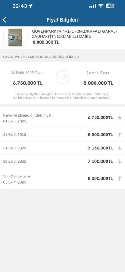 Aynı ilana ait kayıtlara göre fiyat; 4 Eylül’de 6 milyon 750 bin liradan yayınlandı, 21 Eylül’de 8 milyon 500 bine çıktı, 24 Eylül’de 7 milyon 150 bine indi, 30 Eylül’de 7 milyon 100 bine düşerken, 2 Ekim’de tekrar 8 milyon liraya çıkarıldı. Bu dalgalı fiyat değişimi, bakanlığın “manipülatif fiyat artışı” tespitiyle sonuçlandı.