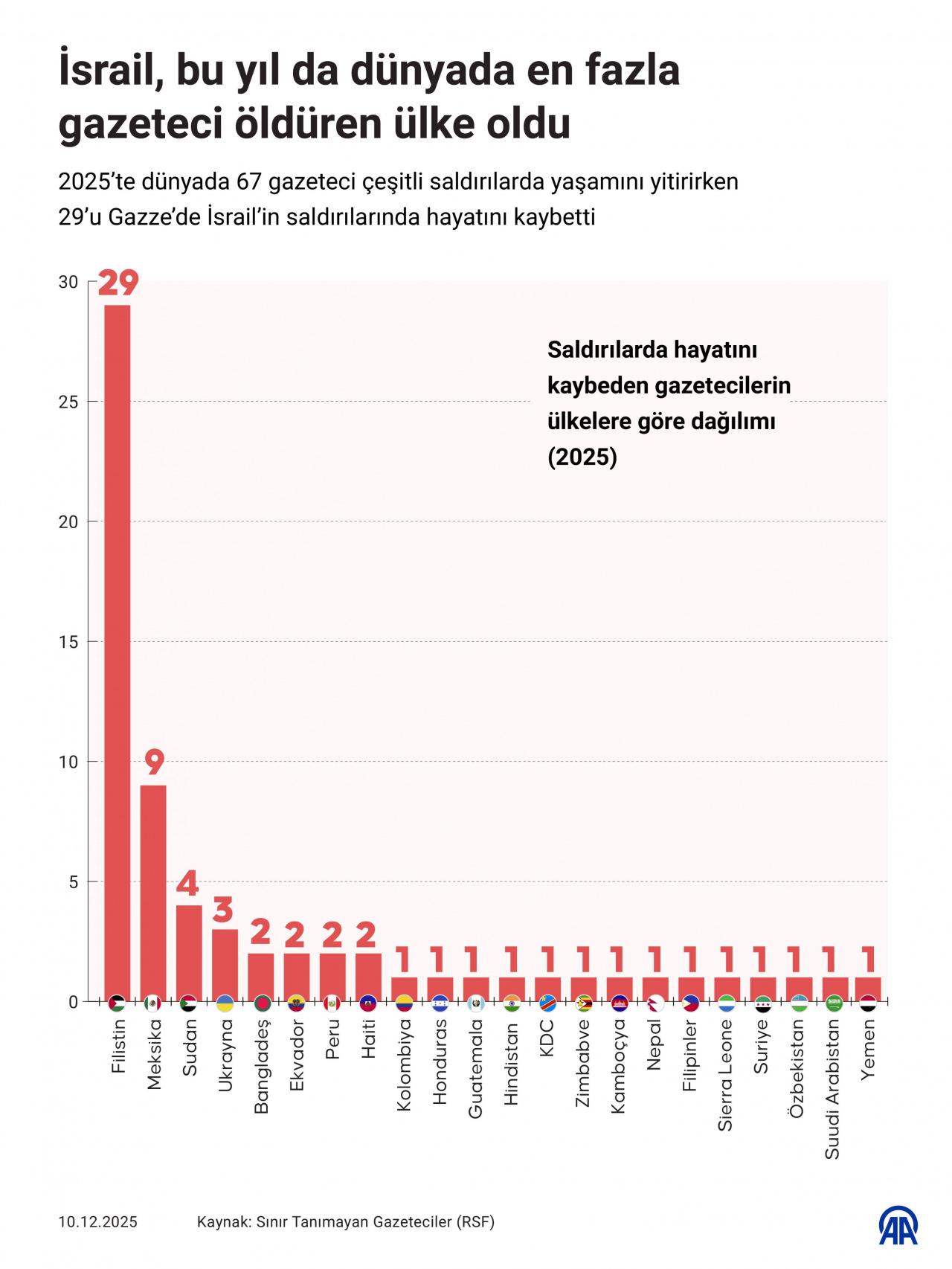 İsrail’in Gazze’ye düzenlediği saldırılarda, 2025’te 29 Filistinli medya mensubu hayatını kaybetti. Bu da dünya genelinde yıl içinde öldürülen gazetecilerin yüzde 43’nünün İsrail saldırılarında öldürüldüğünü ortaya koyuyor.