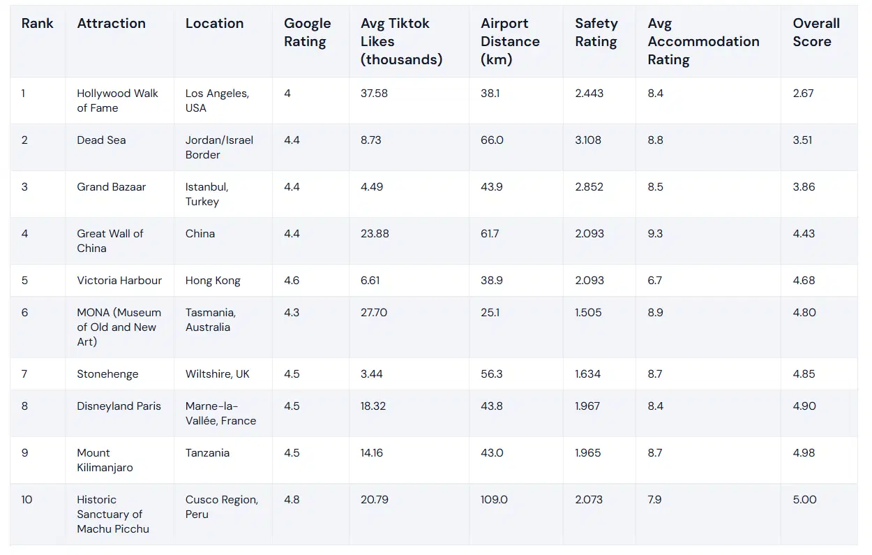 Bir bavul depolama şirketi tarafından gerçekleştirilen araştırmada, dünyanın en hayal kırıklığı yaratan turistik noktaları belirlendi. Dünyanın dört bir yanından 101 turistik noktayı inceleyen araştırmacılar, TikTok’taki beğeniler ile Google yorumlarını analiz ederek kapsamlı bir değerlendirme yaptı.