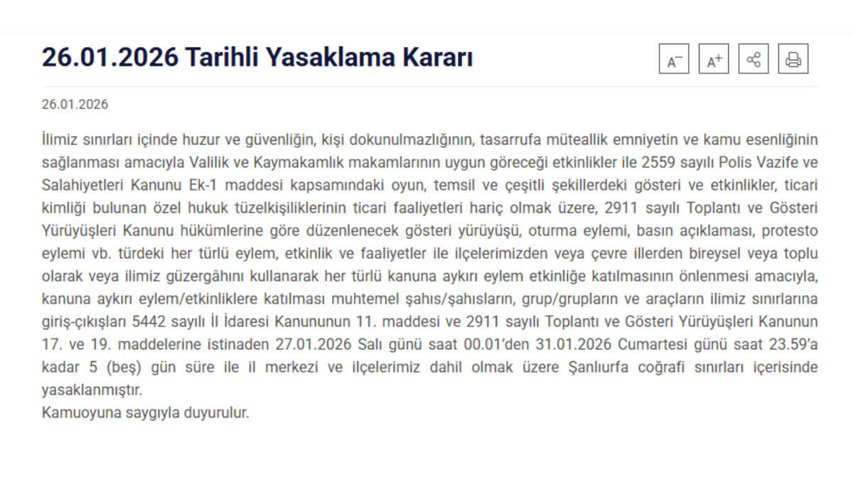 “İlimiz sınırları içinde huzur ve güvenliğin sağlanması amacıyla Valilik ve Kaymakamlık makamlarının uygun göreceği etkinlikler dışında, 2559 sayılı Polis Vazife ve Salahiyetleri Kanunu Ek-1 maddesi kapsamındaki tüm gösteri ve etkinlikler ile 2911 sayılı Toplantı ve Gösteri Yürüyüşleri Kanunu hükümlerine göre düzenlenecek gösteri yürüyüşü, oturma eylemi, basın açıklaması, protesto eylemi gibi her türlü etkinlik, ticari faaliyetler hariç olmak üzere, 27 Ocak 2026 Salı günü saat 00.01’den 31 Ocak 2026 Cumartesi günü saat 23.59’a kadar 5 gün boyunca Şanlıurfa il merkezi ve ilçelerinde yasaktır.”